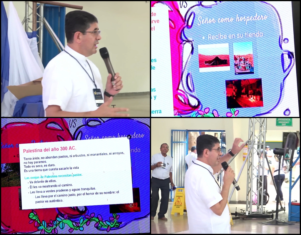 Su ponencia, titulada “Como catequista como pastoreo mis ovejas”, abrió con la oración comunitaria del Salmo 23: “El Señor es mi pastor, nada me falta…”. A partir de este texto bíblico, el padre Silva desarrolló dos ejes fundamentales: la figura del Señor como Pastor y, posteriormente, como Hospedero, destacando su papel guía y protector en la vida del creyente.